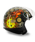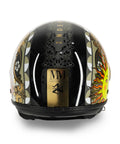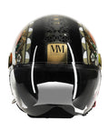 Sulla calotta è raffigurato un coinvolgente intreccio di temi geometrici e foglie d'acanto in sfumature di grigio e nero, su cui spiccano i fiori di Zagara e i frutti delle piante di agrumi — arance e limoni — resi in tonalità scure e impreziositi da dettagli in oro. Sul lato sinistro spicca una rappresentazione ridente del Sole, volutamente inserita per esaltare il tema. Il casco jet Magnolia Nero non è solo un dispositivo di sicurezza, ma un oggetto di stile e identità, capace di raccontare la Sicilia vulcanica attraverso forme, simboli e materiali di altissimo livello.