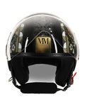 Il casco jet Magnolia Nero di MM Independent è un omaggio alla terra dell'Etna e alla sua potenza primordiale. Una base nera profonda fa da tela a un coinvolgente intreccio di motivi siciliani — temi geometrici, foglie d'acanto, fiori di Zagara e frutti di agrumi — declinati in sfumature di grigio e nero e impreziositi da finiture in oro Chrometech®. Il contrasto tra la profondità del nero vulcanico e la luminosità dorata dei dettagli evoca il legame tra la forza della natura e la raffinatezza dell'artigianato siciliano.